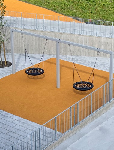 Covering 300 m², our retained fall protection system stands as a testament to how sustainability and innovative aesthetics can beautifully coexist. The secret? Made from cork, a natural, recyclable, and renewable material, the surface has an earthy hue and organic texture that perfectly harmonises with its surroundings…